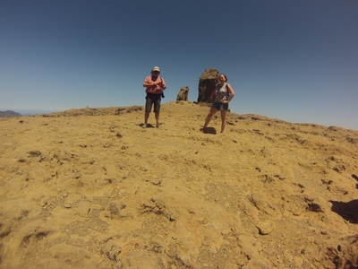 Nous voilà partis pour aller au top. Le long de cette grimpette, nous remarquons les grottes d’habitation, et toujours ce magnifique paysage. Arrivés au sommet de la roche (on a eu chaud !!!), se trouve un lieu de culte (type de sanctuaire) aux divinités au cours de l’époque aborigène, sur une crête de la face de la roche: son nom est Almogaren. Ce sanctuaire est composé d’un système complexe de canaux et de cavités creusées sur deux plates-formes reliées entre elles par un bassin central. Les sculptures ont été utilisées pour faire des offrandes dans les rituels de la fertilité. La zone est entourée par un mur de pierre, peut-être construit pour protéger l’espace du monde profane.