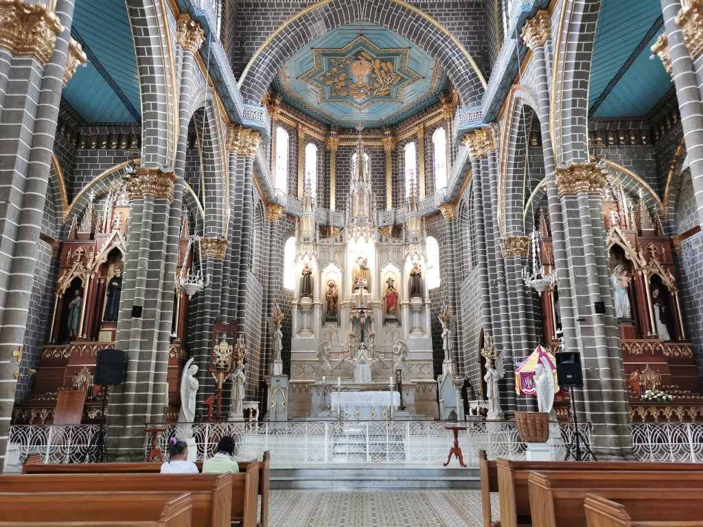 Elle domine l’ensemble. Sa construction a débuté en 1870 et elle est depuis devenue un symbole emblématique de Jardin. On s’émerveille devant sa façade imposante, de style néo gothique, construite en pierre sculptée à la main. Que dire de ses détails architecturaux et ses vitraux colorés, ses colonnes en bois… nous sommes face à une merveille architecturale tres imposante.
