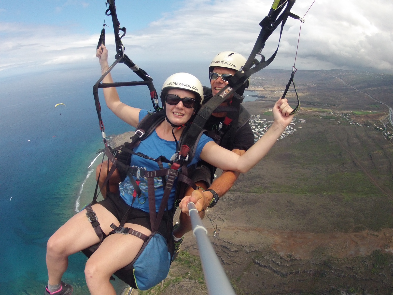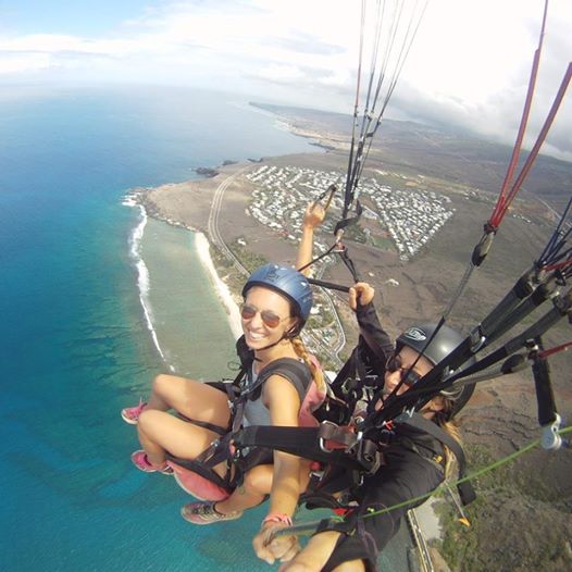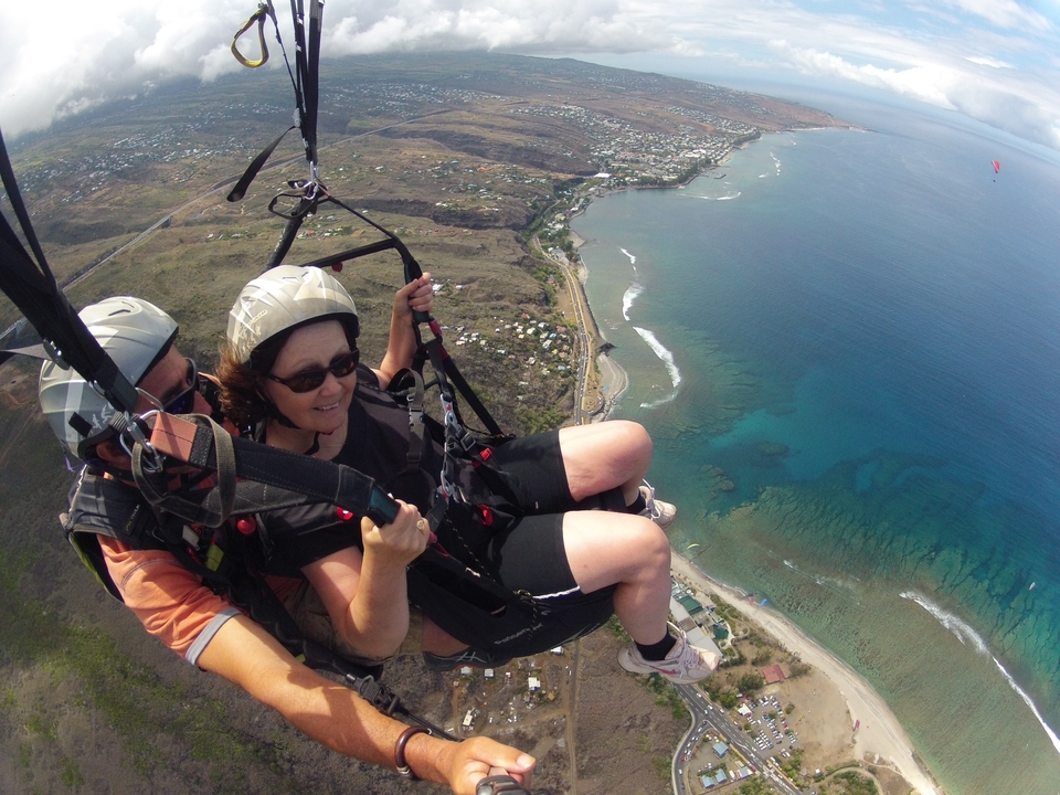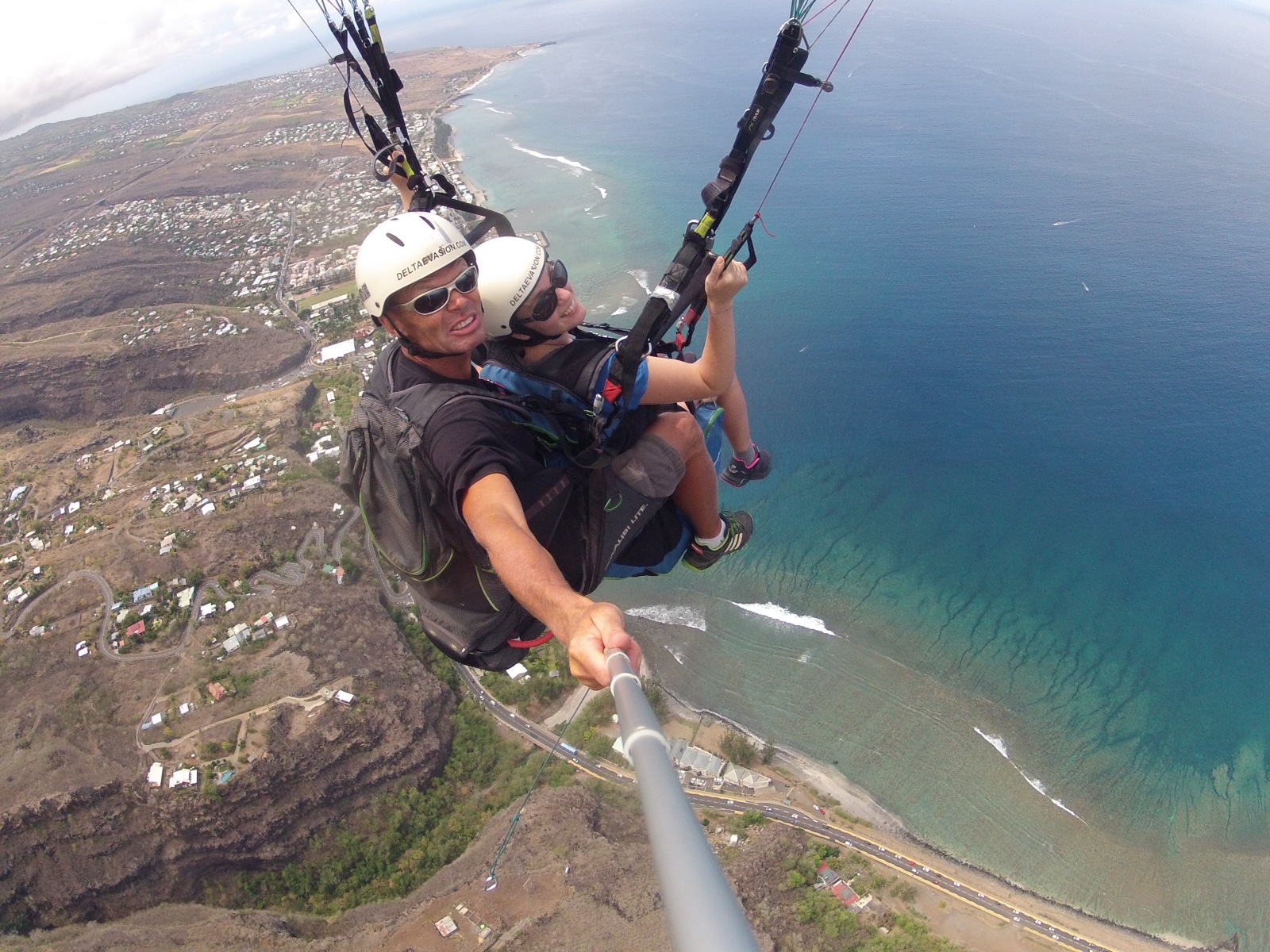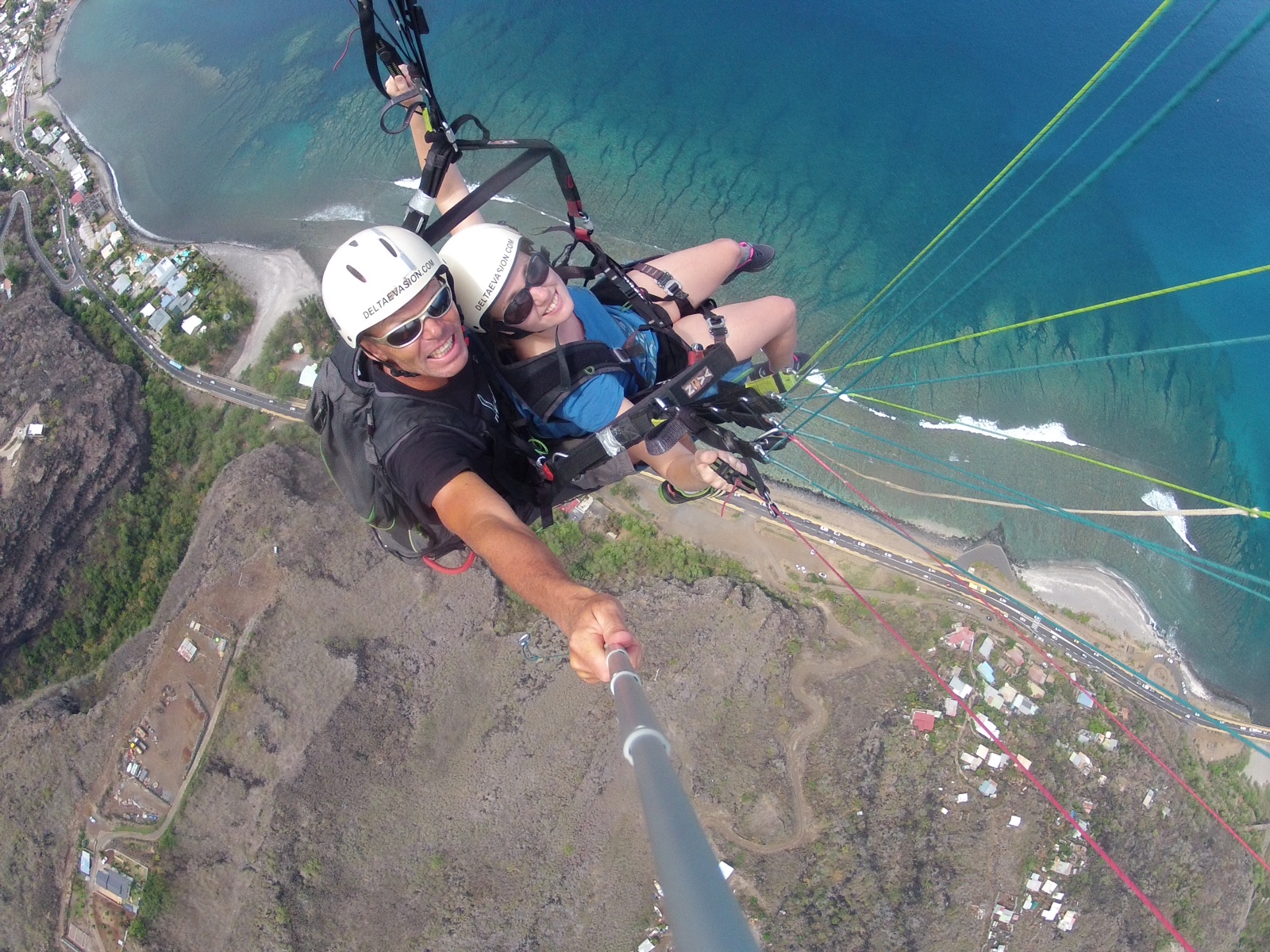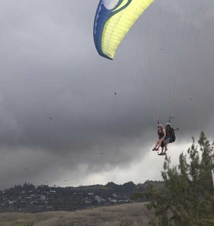 Le vol dans le ciel de St Leu est en tandem (parapente biplace) avec un moniteur diplômé.