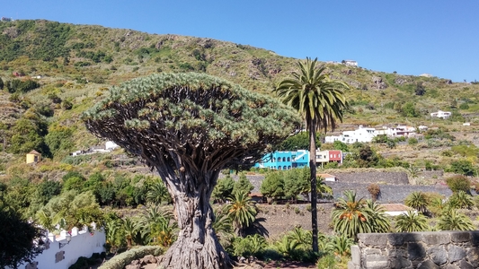 icod dragonnierIcod de los Vinos, citée juchée sur les hauteurs, est célèbre pour son arbre dragonnier  et ses vins. Pour cette arbre légendaire, … il aurait 2500 ans … l’âge exact n’est pas connu mais qui est au moins millénaire. Le dragonnier des Canaries (Dracaena draco), est une plante arborescente, rare à l’allure d’un grand parasol. Celui-ci atteint une hauteur de 20m avec un tronc de 10 de diamètre à sa base.